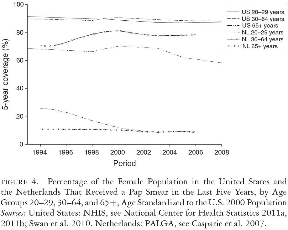 Compared with the register-based data for the Netherlands during the last twenty years, answers to survey questions may be biased upward because the number of self-reported tests is typically higher than the number shown in medical record data. The longer the question recall period was—for example, having had a Pap smear within the last five years versus within the last year—the less over-reporting there was. A recent meta-analysis (Howard, Agarwal, and Lytwyn 2009) found, for Pap smears, a report-to-record ratio of 1.1 for a five-year interval, 1.2 for a three-year interval and 1.3 for a two-year interval, and 1.3 for the only study with a one-year interval and complete registration. A comparison of record-based Pap tests in a large nonprofit HMO with self-reports from the NHIS found the reported rates to be 34 percent and 63 percent higher in the NHIS than in the HMO for the age groups eighteen to twenty-nine and sixty-five and older but were quite similar for the age group thirty to sixty-four, which contributes the most Pap smears (Insinga, Glass, and Rush 2004). There was also a downward bias in the NHIS data, however, because for those women having more than one Pap smear in the last year, only one was counted. Even assuming that on balance, the over-reporting of recent Pap smears could be as high as 30 percent in the NHIS, we estimated that the Pap smear use in the United States is still more than three times greater than in the Netherlands.