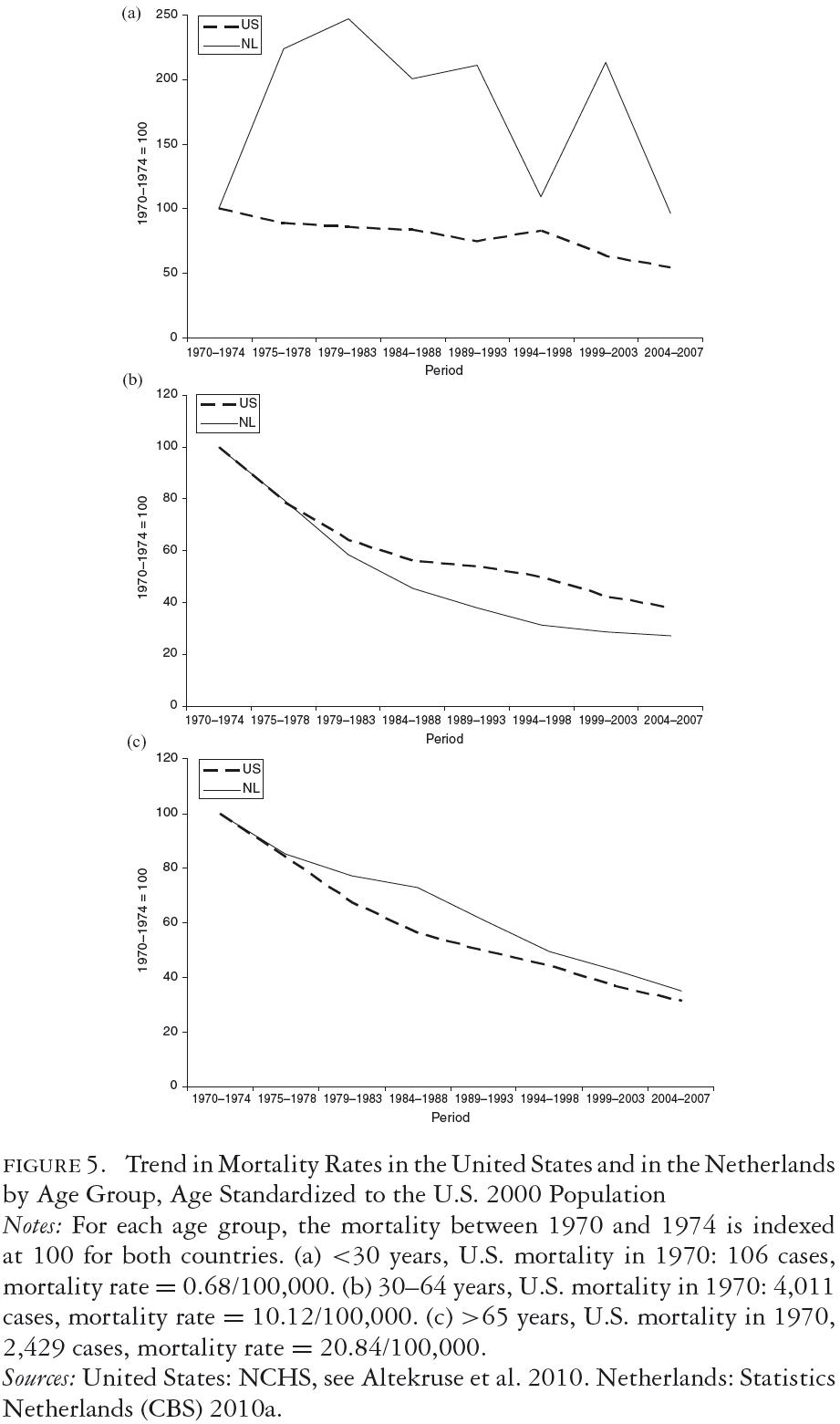 In order to make data comparable across time and between the United States and the Netherlands, a weighted average of mortality (or incidence) rates for five-year age groups was used, with the weights corresponding to the age composition of the U.S. population in the year 2000. This standardization applies to total population rates as well as to rates for broader age-intervals, which are composed of five-year age groups.