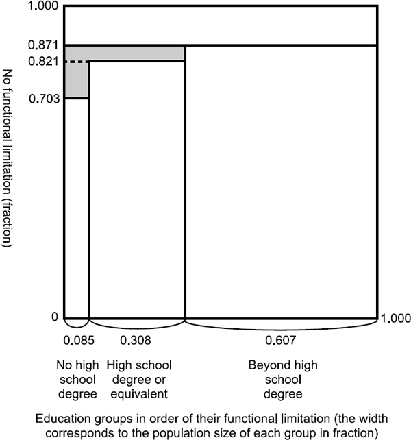4. The shaded area represents education-specific disparity in functional limitation. The value for this area is 0.030 (= [0.871 – 0.703] × 0.085 + [0.871 – 0.821] × 0.308), which can be interpreted as follows: in order to eliminate education-specific disparity, 3.0% more people in Wyoming must become free of functional limitation, and these people must come from the two lower-education groups.