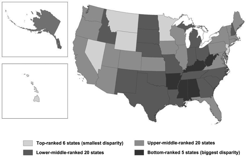 Generally, our results show a lack of consistency in the rankings of overall and attribute-specific disparities in age-adjusted rates of functional limitation across states. None of the best-performing states in overall disparity, as reported in table 1, fare consistently well in all of the four attribute-specific disparity rankings. The strength of correlations between rankings by attribute-specific disparities is generally weak to modest. For example, across all states Spearman's correlation coefficient for the rankings by sex- and race/ethnicity–specific disparities is 0.11, and that by income- and race/ethnicity–specific disparities is 0.48 (appendix 1), with two exceptions. First, rankings by income- and education-specific disparities tend to be similar (Spearman's correlation coefficient of 0.83). Second, the worst-performing states, as reported in table 1, have similar rankings across overall and income-, education-, and race/ethnicity–specific disparities.