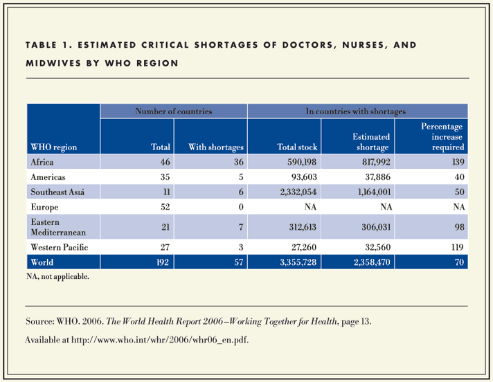 The world is experiencing a serious human resource shortage in the health sector, which the World Health Assembly calls "a crisis in health." The World Health Organization (WHO) estimates that 4.3 million more health workers are required to meet the health Millennium Development Goals (MDGs)—a global compact to reduce child mortality, improve maternal health, and combat AIDS, malaria, and other diseases by 2015. But even this alarmingly high figure significantly underestimates the global need for human resources because the WHO only accounts for shortages in 57 countries that miss the minimalist target of 2.28 doctors, nurses, and midwives per 1,000 in the population. These 57 countries have "critical shortages," but the WHO estimate does not take into account the shortages of health workers experienced in countries who provide services in excess of basic immunizations and childbirth attendance. The agency does not factor in the shortages that emerging and developed countries claim to be experiencing. Nor does it factor in the marked human resource disparities among countries and regions, which reveal that shortages in low-income countries are actually much worse.