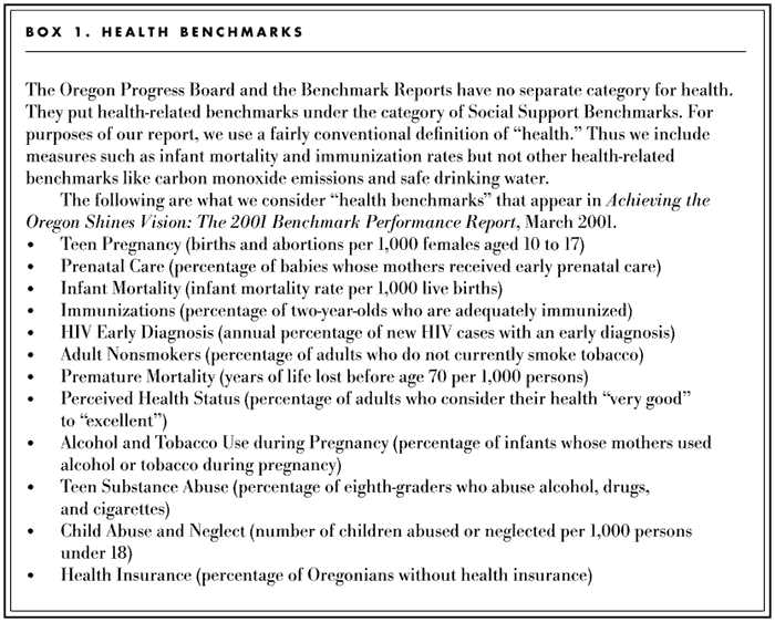 What distinguishes the Oregon benchmarks from similar data-gathering enterprises, and what should make them of interest to officials in other states, is the comprehensiveness of the Oregon model, which incorporates social, economic, educational, and cultural indicators. Health indicators are an integral part of a broad system, based on outcomes, of monitoring progress toward a desired future. The health of Oregonians (see box 1) is not only valuable in its own right but is essential to other important values, including a well-educated and well-trained population and a robust economy. One of the many political lessons to be learned from the Oregon experience is that state and county health officials report that they gain enhanced political visibility for their health agendas by emphasizing the broad social value of health. This is especially true at the county level, where public spending on health usually runs a distant third behind spending for jails and roads. By linking health to a comprehensive set of indicators and targets, health officials may gain unexpected allies.