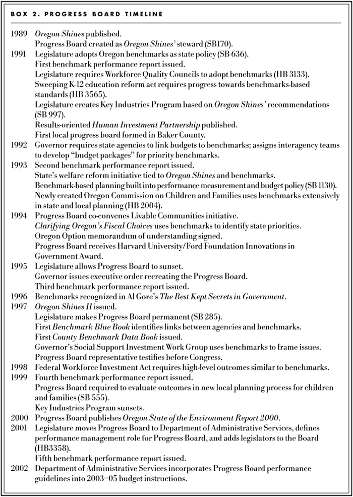 Box 2 provides a complete history of the Oregon Progress Board and the benchmarks. The history can be divided into three overlapping periods: high hopes; disillusionment; and rebuilding.