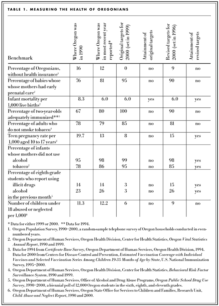 Table 1 demonstrates that Oregonians attained only one of the original targets: infant mortality was reduced from 8.3 deaths per 1,000 live births to 6.0. In one case—alcohol use among eighth-grade students—the group was actually worse off than in 1990. There was significant progress in early immunization of two-year-olds (from 67 to 80 percent) and teen pregnancy rates (from 19.7 to 15.9 per 1,000 females aged 10 to 17). Nevertheless, the state fell far short of most of its original 2000 targets.