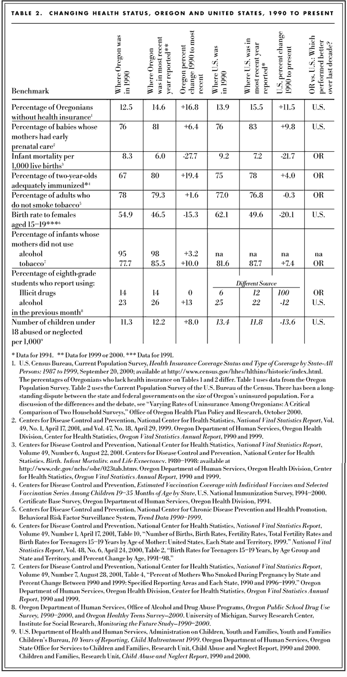 An alternative, and perhaps more appropriate, way to judge Oregon's success over the last decade is to compare the state's progress to that of the rest of the nation. This approach is more in keeping with traditional "benchmarking" and avoids the problems inherent in setting targets ten years into the future. By this standard, Oregon was average (see table 2). The state outperformed the nation on five measures: increased immunization of two-year-olds and reductions in cigarette use by adults in general, smoking by pregnant women, use of illicit drugs by eighth-graders, and infant mortality. Oregon fell short of the national rate of improvement on five other measures: expanded health insurance and early prenatal care and reductions in the teen birth rate, eighth graders' use of alcohol, and child abuse and neglect.2 It should be noted that Oregon's most recent rate was superior to the U.S. average in seven of ten cases.