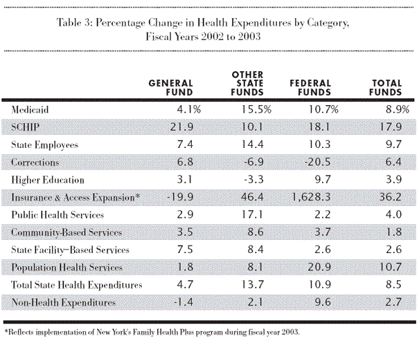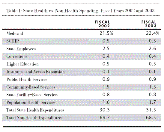 The surge in health care costs, most notably in Medicaid and employees’ health insurance, has been a significant factor in state fiscal stress, particularly in the fiscal years 2002 and 2003 covered in this report. While Medicaid dominates in both dollars and in impact on state fiscal conditions, state spending in non-Medicaid programs accounted for $95.6 billion in FY 2002 and $102.7 billion in FY 2003a rate of increase of 7.5 percent. Overall, health spending increased by $28 billion from FY 2002 to FY 2003, or 8.5 percent, exceeding the overall increase in state spending during this same period, which was 4.5 percent.