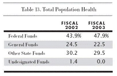 Injury Prevention: In the previous edition of the State Health Care Expenditure Report, Texas Department of Transportation inadvertently included the cost of highway capacity, grade separations, and maintenance along with highway safety programs in this category of population health expenditures. The magnitude of the overstatement is not known, but these programs are not included in the data reported for fiscal years 2002 and 2003 reported in this edition.