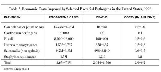 Buzby, J. C., T. Roberts, C.T. Jordan Lin, and J.M. MacDonald. 1996. Bacterial Foodborne Disease: Medical Costs and Productivity Losses. Washington, D.C.: Economic Research Service, U.S. Department of Agriculture.