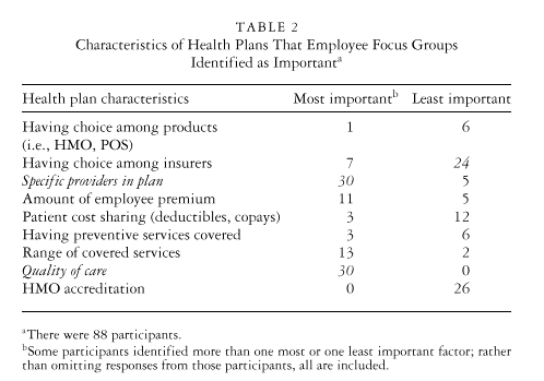 Table 2 reports employees’ expressed preferences regarding health plan characteristics. Over 60 percent of the focus-group participants rated either access to specific providers or quality of care as the most important factor. It is likely that, in the view of employees, these two aspects capture the