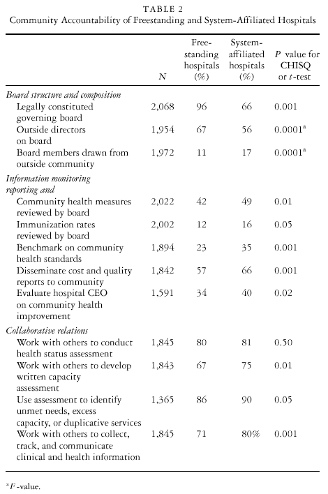 Table 2 compares freestanding and system-affiliated hospitals, based on their measures of community accountability. System-affiliated hospitals rated lower than freestanding hospitals on the first dimension of community accountability: the legal form and structure of a hospital board. Specifically, system-affiliated hospitals were less likely than free-standing hospitals to possess a legally constituted, local governing board (Â D 328.01, p < :001). Notably, all of the system-affiliated hospitals in our sample that did not operate a legally constituted governing board did possess an advisory board. This finding is consistent with those of