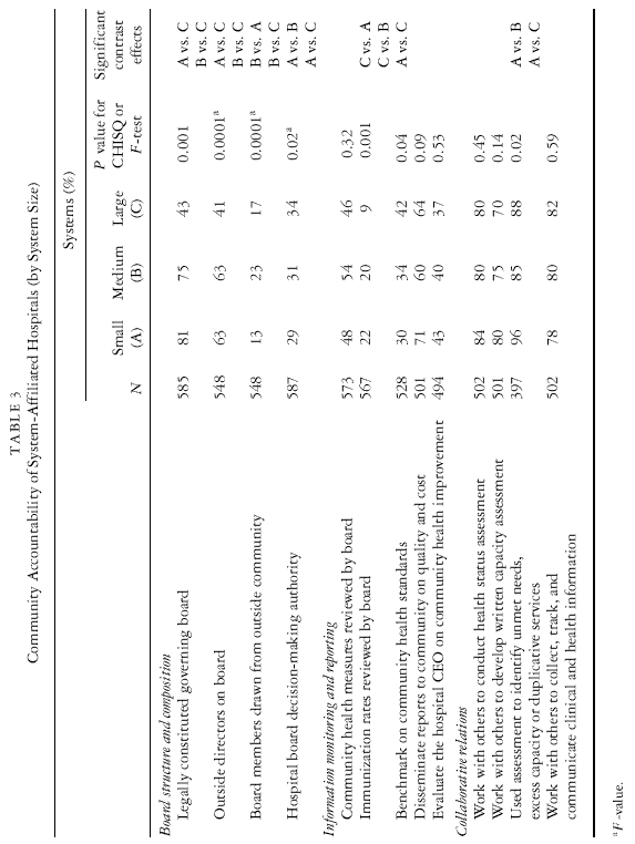 Because health care systems are not uniform in their structures or strategies, global comparisons between freestanding and system-affiliated hospitals may mask important differences among system-affiliated hospitals. To address these concerns, we compared hospitals affiliated with different system attributes––specifically, size, geographic scope, and ownership–– in order to discover how, and to what extent, they express community accountability. Table 3 presents the results for system size. We found several significant differences in structural attributes of the hospital board that are associated with higher community accountability. For example, hospitals in smaller systems were more likely to have a legally constituted governing board (Â D 72:56; p < :001), a higher proportion of outside