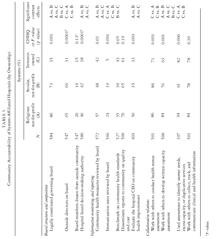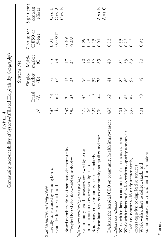 Table 4 presents the results of comparisons across systems on the basis of their geographic scope. In general, we observed few statistically significant differences in community accountability among rural, single-market, and multimarket systems. To some extent, this may be an artifact of our classification scheme. Eighty percent of the hospitals in our sample belong to multimarket systems, whereas only 6 percent belong to rural systems. Thus, unequal cell sizes and consequent lack of statistical power may contribute to the rather low number of significant differences we observe. Notwithstanding this potential limitation, we did observe three statistically significant differences in the structural forms of community accountability. Specifically, hospitals affiliated with multimarket systems were less likely than hospitals affiliated with single-market and rural systems to have either a legally constituted governing board (Â D 8:35; p < :05) or a large pro-portion of outside members on the board ( F D 12:16; p < :0001). We observed only one significant difference in terms of board information