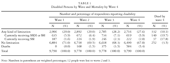 We found a correspondence between the breadth of the definition of disability at wave 1 (1992) and the probability of death between wave 1 and wave 4 (1998) (table 1). Mortality rates were higher for people who were disabled according to the narrower definition, supporting the notion that the more restrictive definition identified more severely health-impaired individuals, on average. Among people receiving SSDI/SSI at the 1992 interview, 19.7 percent had died by the fourth interview in 1998, a nearly identical rate as the subset of people who reported receiving SSI (17.8 percent). Of people with any limitations, 10.1 percent died, compared with 3.5 percent of those without any limitation.