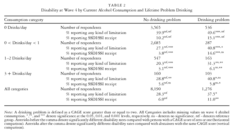 And availability of other sources of support, such as private employment-based disability coverage, may be related in part to an individual’s alcohol consumption levels (Harwood, Fountain, and Livermore 1998).