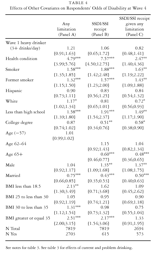 We reestimated all models of SSDI/SSI receipt, limiting the sample to respondents under the age of 65. The results were virtually unchanged. We also altered the definition of problem drinking and the specification of other drinking variables in the models. Our findings were very robust to changes in variable definition and model specification.