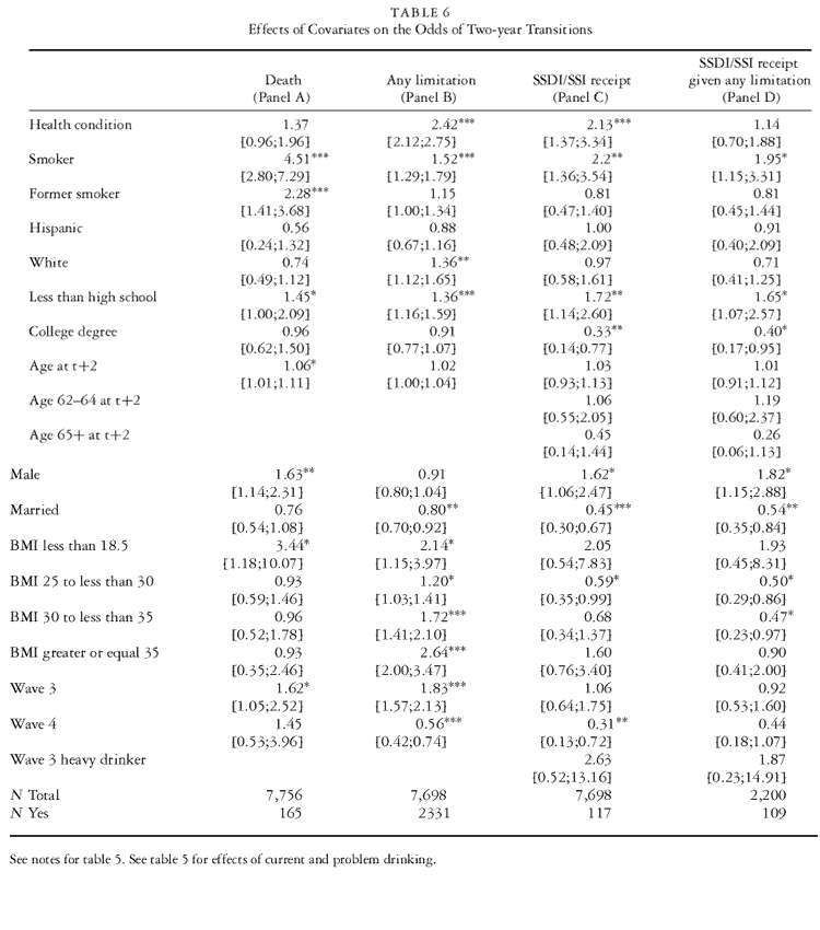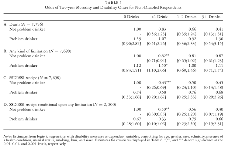 In the longitudinal analysis, which permitted inferences based on the temporal sequencing of events, alcohol consumption was not signifi-cantly related to mortality, but had significant effects on having any limitation and on the probability of SSDI/SSI receipt. Problem drinkers were more likely to develop a limitation during a two-year transition period, while moderate drinkers without a problem-drinking history were less likely to develop a limitation or to start receiving SSDI/SSI. Compared with abstainers, problem drinkers and heavy drinkers were, if anything, less likely to start receiving SSDI or SSI. The 1996 statu-tory change designed to further restrict eligibility of people with drug and/or alcohol problems had no effect on public transfer receipt by heavy drinkers.