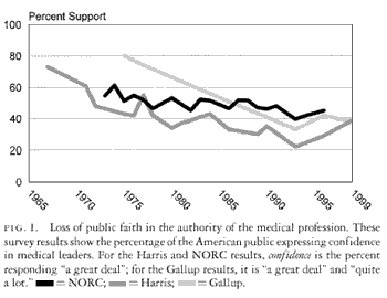 The data from these three sources are presented in figure 1. The responses on all three time series suggest a waning of public confidence dating back to the early 1970s, with the NORC and Harris data beginning to diverge in the mid-1970s. Between 1975 and 1995, public confidence in medical authorities measured on the General Social Survey was relatively stable. Researchers who have analyzed these data have therefore concluded that the decline in public confidence in the medical profession was no greater than that experienced by various other American social institutions (Pescasolido et al. 2001). In contrast, the Harris data indicate a larger and more sustained loss of medical authority. Researchers using these data have decided that the loss of professional legitimacy in American medicine was far more pronounced than that experienced by other social institutions. These surveys suggest that over a 30-year period, American medicine went from being perhaps the most trusted to being one of the least trusted social institutions (Blendon et al. 1993).