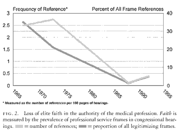 claims based on professional authority, per 100 pages of (written and oral) testimony. The second measure counts the frequency with which the professional medical frame is invoked in testimony, compared with other legitimizing frames. By either measure, the decline between the 1970s and late 1980s in elites’ use of the professional frame to rationalize health care reform is dramatic. It is difficult to assess accurately the timing of the turning points, given the extended periods during which there were few congressional hearings related to health care reform. Nonetheless, it appears that the elite use of the professional frame may already have been on the upswing by the early 1990s, during the debate over the Health Security Act. As with public opinion, however, elite use of a professional frame to legitimize reforms remained much less common during the 1990s than it was in earlier debates. (Corroborating evidence can be found in the historical comparisons presented by Skocpol (1996) and Johnson and Broder (1996), each of which contrasted the Clinton-era reform debates with previous debates over national health insurance.)