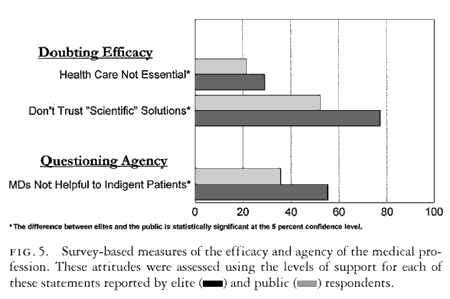 Although these measures of professional legitimacy for both the public and elites obviously are limited, they further document the substantial decline in the confidence in the American medical profession in the late 20th century. But measures of this sort cannot provide many insights into why doubts about professional legitimacy began to emerge, nor can they tell us much about the relationship between elite and public attitudes. Although there is evidence that the rebound in professional legitimacy during the 1990s occurred first among elites, it is difficult to discern from these sorts of turning points whether elite assessments are really “trickling down” to affect public attitudes (Zaller 1992). To gain more insights into the nature of the threats to the professional legitimacy of American medicine, we need to consider more carefully the potential sources of doubt about medical authority.