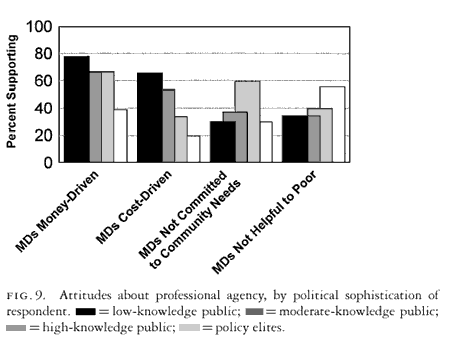Perhaps the most pronounced difference between policy elites and the general public rests in their knowledge about substantive matters relevant to health policy issues. Most of the American public is largely ignorant of both public policy in general (Delli Carpini and Keeter 1996) and health policy in particular (Blendon et al. 1993). More knowledge about health policy can be expected to exacerbate certain threats to medical authority while partially ameliorating others.