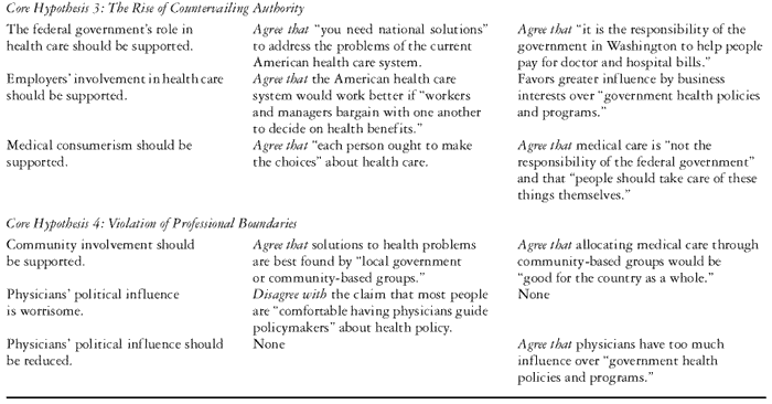 Our review of the literature has identified 13 hypotheses about threats to medical authority, grouped into four categories (table 1). Some of these potential threats reflect widespread shifts in prevailing societal norms, such as the growing doubts about science or the increasing acceptance of an active role for government in the health care system. Because these are deeply rooted in American society, we would expect them to be reflected in the attitudes of both the general public and policy elites.