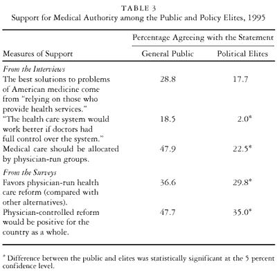 Note that the apparent level of support for professional authority differs significantly across these questions. Some of this variation can be attributed to differences in the questions’ wording or the categorization of response scales. But the most pronounced differences reflect the implicit extent of physician control. Just under half the public (between a quarter and a third of elites) endorsed reforms giving physicians some control over the allocation of medical resources (the third and fifth rows of table 3). However, the more extreme proposition giving physicians “full control” over the medical care system (the second row of table 3) was supported by less than 20 percent of the public and a scant 2 percent of political elites.