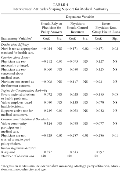 Measures from the Interviews. The interviews explored a variety of strategies for health care reform. As part of this inquiry, we asked the interview subjects a set of closed-ended questions about each strategy. Three responses serve here as measures of support for professional authority. First, subjects were asked (on a five-point scale) the extent to which they agreed or disagreed with the statement “The best solutions to our country’s health care crisis can be found by relying on those who provide health services.” Second, agreement was measured for the statement “The health care system would work better if doctors had full control over the system.” Third, after having been asked about various statements describing the role of physicians in American medicine and health policy, the subjects were asked about their general support for health reforms that delegated authority for allocating medical resources to groups of doctors. The response (also on a five-point satisfaction scale) to this deliberately more ambiguous stimulus was intended to evoke a more generalized reaction to professionalism in health care.