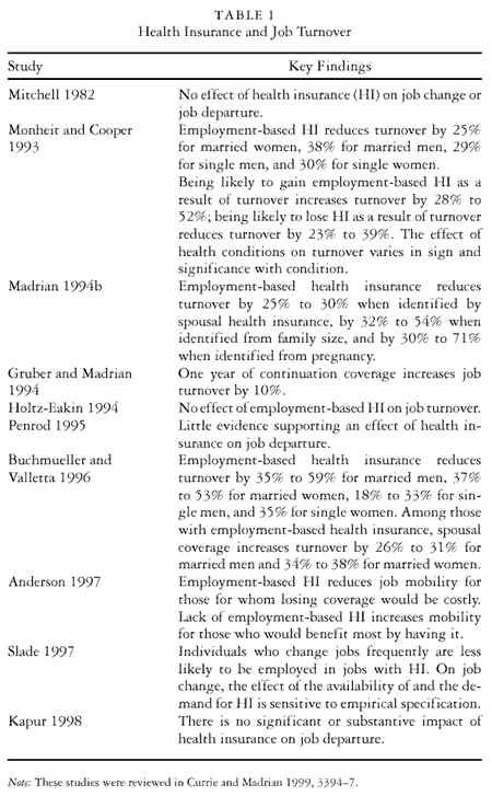 Do firms offering health benefits recruit and retain higher-quality workers than do firms that do not provide health coverage to workers? Are firms offering health insurance more likely to attract workers interested in a long-term employment relationship? Many studies (see table 1) suggest that workers in jobs with health insurance coverage change jobs less frequently than do workers in jobs without health benefits (Anderson 1997; Buchmueller and Valletta 1996; Madrian 1994b; Monheit and Cooper 1994; Slade 1997). Evidence for this relationship remains some-what mixed, however, with other studies suggesting that offering health insurance has very little or no effect on job turnover (Holtz-Eakin 1994; Kapur 1997; Mitchell 1982; Penrod 1995). Moreover, even if researchers could agree on whether and how much health coverage affects turnover, they would still disagree about the productivity implications of the turnover effect.