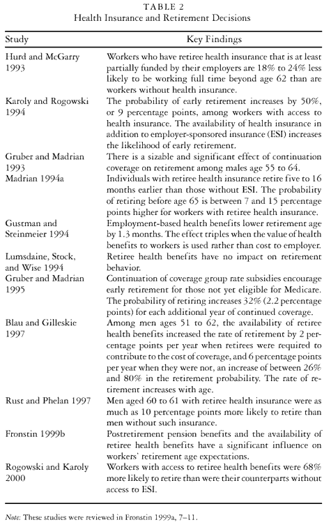 Empirical studies also show that the availability of health benefits affects retirement choices (see table 2). Individuals covered by employment-based health insurance plans while working are less likely to retire early (i.e., before they reach age 65 and become eligible for Medicare) if doing so would mean losing those health benefits. Therefore, access to employer-sponsored retiree health benefits substantially increases the likelihood of early retirement (Karoly and Rogowski 1994; Madrian 1994a; Rogowski and Karoly 2000). The continuation of coverage options is also shown to increase the likelihood of early retirement (Gruber and Madrian 1993), but to a lesser extent than do employer-funded retiree health benefits, since retirement choices also depend on the cost of coverage to workers ( Johnson, Davidoff, and Perese 1999). No studies addressed the issue of worker quality, and there is far from any consensus on what the impact of health coverage on retirement means for firms’ productivity and profitability.
