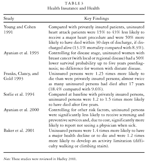 The existing studies found little evidence that workers with health coverage are absent less often than are workers without coverage. For example, the Rand Health Insurance Experiment found that the effect of insurance coverage on work loss days was small and insignificant (Buchmueller 2000, 14). Similarly, despite years of research outside mainstream economics (in human resources and industrial psychology), there is almost no direct evidence regarding the effect of health insurance coverage on morale and worker productivity and the firm’s performance. In those fields, although the link between employment practices and productivity is widely recognized, “the linkages between productive behavior and psychosocial job structure have remained unclear in the eyes of many observers” (Karasek and Theorell 1990, 162). However, there is compelling research demonstrating that health insurance has a powerful influence on access to health care, the timeliness of care, the amount and quality of care received, and fundamental health (see table 3). People without health insurance are less likely to seek medical care, less likely to get it, and, as a result, more likely to be in worse health and have higher death rates than are people with insurance coverage (for comprehensive reviews of this evidence, see ACP–ASIM 1999; Hadley 2001; and U.S. Congress 1992). Uninsured persons have a much greater risk of health decline and death, with several studies showing them to be 1.2 to 1.5 times more likely to die than are insured persons (Baker et al. 2001; Franks, Clancy, and Gold 1993; Sorlie et al. 1994).