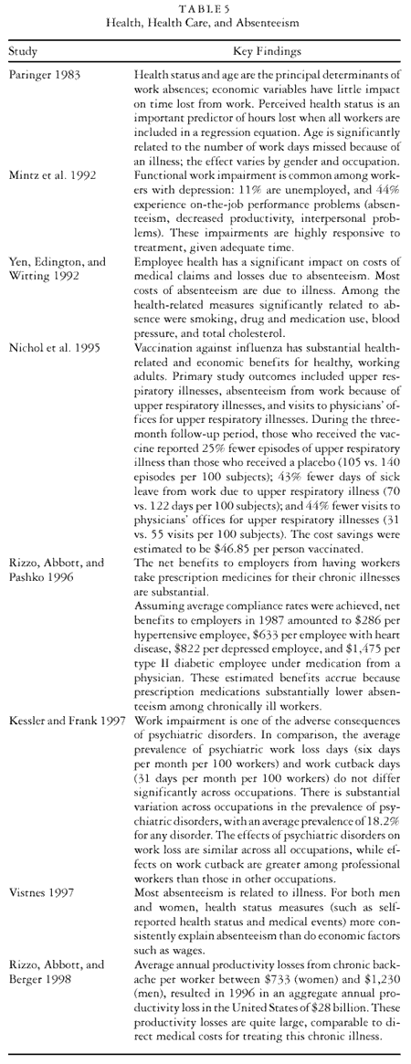 Researchers are also beginning to calculate the costs to employers of unhealthy employees. Some studies demonstrated that poor health may be related to increased absenteeism (see table 5) and lower productivity (see table 6). Other studies examined the effects on workplace productivity of specific health conditions and health risks, including hypertension, heart disease, obesity, depression, and asthma. These studies showed that the productivity effects of illness result mostly from absences (Frank and Manning 1992; Paringer 1983; Rizzo, Abbott, and Berger 1998; Rizzo, Abbott, and Pashko 1996; Vistnes 1997; Yen, Edington, and Witting 1992). Poor health, as the studies of workers’ labor market outcomes suggested, may also lead to turnover and early retirement. “In extreme cases, poor employee health may also lead to premature death, resulting in significant turnover costs to employers from the search for new workers and subsequent training” (Greenberg, Finkelstein, and Berndt 1995, 27). Research also demonstrates that exhausted, depressed, sick, or injured workers are not energetic, accurate, or innovative at work, leading to productivity losses. The studies show that poor health reduces workers’ productivity at work, and that effective health care treatments can reduce productivity losses and may even “pay for themselves” in terms of increased productivity (Berndt et al. 1998; Burton et al. 1998, 1999, 2001; Frank and Manning 1992; Kessler and Frank 1997; Rizzo, Abbott, and Berger 1998; Rizzo, Abbott, and Pashko 1996).