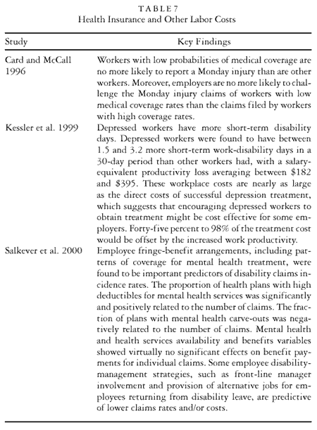 The relationship between firms’ health insurance offerings and the incidence and cost of disability and workers’ compensation claims has received only scant attention in the literature (see table 7). As Thomas Buchmueller observed in his review of the evidence, only one study (Card and McCall 1996) tried to estimate the relationship between health insurance coverage and workers’ compensation claims. Card and McCall’s study tried to determine whether the variation in workers’ health insurance coverage could explain why a disproportionate number of workers’ compensation claims were filed on Mondays. Although uninsured workers were more likely to receive workers’ compensation benefits, Card and McCall found that predicted insurance coverage had no effect on the prevalence of Monday claims. Buchmueller concluded that “Card and McCall’s analysis provides no support for the premise that firms that offer insurance reap a benefit in the form of lower workers’ comp[ensation] claims” (Buchmueller 2000, 11).