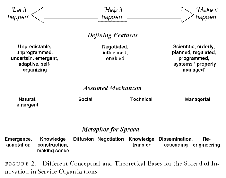 - Complexity studies are derived from general systems theory and regard innovation as the emergent continuity and transformation of patterns of interaction, understood as complex responses of humans relating to one another in local situations: The diffusion of innovations is seen as a highly organic and adaptive process in which the organization adapts to the innovation and the innovation is adapted to the organization (Fonseca 2001). As Figure 2 shows, this organic, adaptive process is not easily—and perhaps not at all—controlled by external change agencies (Plsek 2003).