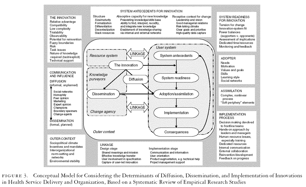his article summarizes the findings of a systematic literature review of the diffusion of service innovations. The United Kingdom Department of Health explicitly commissioned this work, which was carried out between October 2002 and December 2003, for its National Health Service’s extensive modernization agenda (UK Department of Health 2001). Our review, which supplements and extends previous overviews and meta-analyses (Damanpour 1991, 1992, 1996; Granados et al. 1997; Meyers, Sivakumar, and Nakata 1999; Rogers 1995; Tornatsky and Klein 1982; Wejnert 2002; Wolfe 1994), focuses primarily, but not exclusively, on research studies of health care. Because of the size and scope of our review, we cannot describe all our findings or discuss all our sources in this article. Instead, we encourage interested readers to read the complete project report (Greenhalgh et al. 2005a).