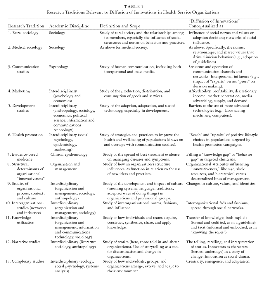 Because of the very large number of empirical sources identified, we have cited in this article only illustrative studies and/or overviews, and we have not given citations for statements for which we had only limited evidence. For a full list of primary sources, please see our main report (Greenhalgh et al. 2005a). We identified 13 research areas that had, largely independently of one another, provided evidence relevant to the diffusion of innovations in health service organizations (Table 1). Four of these traditions can be classified as “early diffusion research”: