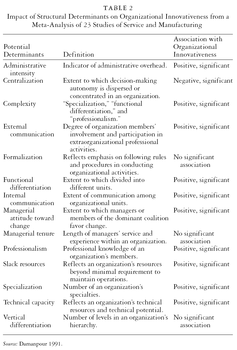 - Studies of the structural determinants of organizational innovativeness, in which innovation was seen as a product or process likely to make an organization more profitable: Organizational innovativeness was regarded as primarily influenced by structural determinants, especially size, functional differentiation (an internal division of labor), slack resources, and specialization (the organization has a clear “niche” in which it offers expertise and specialist resources). In this area, research focuses on collecting quantitative data about the formal structures of organizations, usually by sending questionnaires to the chief executive. Such studies were among the few in our review that were amenable to meta-analysis (Damanpour 1991, 1992, 1996).