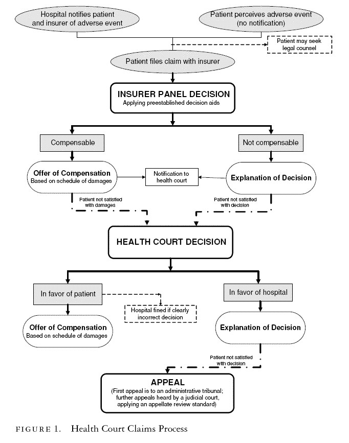 The health court would issue a written explanation of the reasons for its decision. If the event were deemed compensable, the court would assess the damages. The health court’s written decision would be recorded in a keyword-searchable electronic database that could be accessed by adjudicators in future cases involving similar injuries.