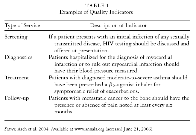 These studies offer a mix of good and bad news for the VHA. However, some of the studies used data collected before the reforms, and all the studies compared specific sectors, conditions, or, in some cases, procedures, and thus do not offer a picture of the VHA’s “overall” relative performance. Fortunately, the system’s overall performance has been assessed as well. For example, an important study in 2004 by Asch and his colleagues used 348 quality indicators across twenty-six conditions and a broad spectrum of inpatient and outpatient services to compare the VHA’s performance with the care of a national sample of non-VHA patients over a two-year period in the late 1990s. Since the system had been reformed only a few years earlier, the quality indicators that Asch and his colleagues used were process measures, which are easier to influence over the short term than are outcomes measures. Moreover, many factors other than the health care system influence health outcomes and therefore process measures may actually offer a clearer picture of the system’s performance. Table 1 shows an example of a quality indicator for each type of service.