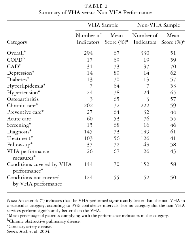 Asch and his colleagues sampled 596 VHA patients and 992 non-VHA patients, all of whom were men aged thirty-five and older, the typical VHA demographic. After adjusting for risk, they found no significant differences between the two samples in the age of the patients or in the number of chronic conditions, although the non-VHA sample had, on average, slightly more acute conditions. In regard to the quality indicators, the VHA patients received significantly better overall care, chronic care, and preventive care. Although the two samples did not differ significantly in acute care, the VHA generally performed significantly better across the whole spectrum of care—screening, diagnostics, treatment, and follow-up. Tellingly, perhaps, the VHA’s relative performance was far better than the non-VHA services for processes and conditions that are—as compared with those that are not—directly targeted as part of the VHA’s performance measurement drive. Table 2 summarizes the VHA’s and the non-VHA’s performance for various categories of care and service.
