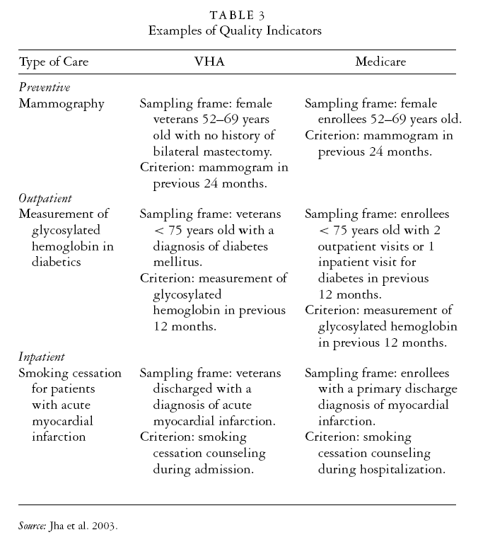 Critics might point out that Asch and his colleagues’ sample sizes were quite small and that the VHA patients were drawn from the relatively restricted geographical area of the U.S. Midwest and Southwest. Fortunately for those who have to “justify” the VHA, other evidence tends to support these findings. For instance, Jha and his colleagues (2003), again using process measures, assessed the change in the quality of the VHA between 1994 and 2000 and compared the quality of the VHA with that of fee-for-service Medicare between 1997 and 2000. The VHA sample was drawn from all Veterans Integrated Service Networks (there are twenty-one “VISNs” in the VHA, each responsible for health care planning and resource allocation in a particular geographical region), and each state was represented in the Medicare sample. Depending on the year, there were between 48,505 and 84,503 patients in the VHA sample. Because the Medicare sample was taken from published sources, it was not possible to ascertain its exact size from Jha and his colleagues’ article, but it amounted to many thousands. Table 3 gives an example of a quality indicator used by Jha and his colleagues in each of preventive care, outpatient care, and inpatient care, together with the sampling frame and criteria used in the VHA and Medicare.