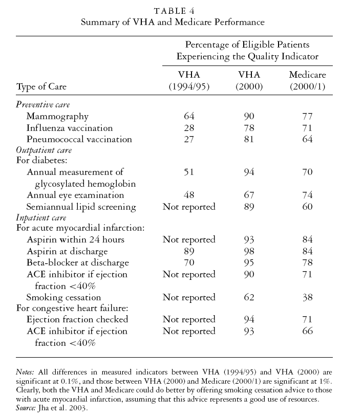 Table 4 summarizes many of Jha and his colleagues’ results and shows both that the VHA’s performance improved substantially on several criteria between 1994 (before the reforms) and 2000 and that by 2000 the VHA was performing significantly better than Medicare on twelve of thirteen quality indicators common to both programs at that time.