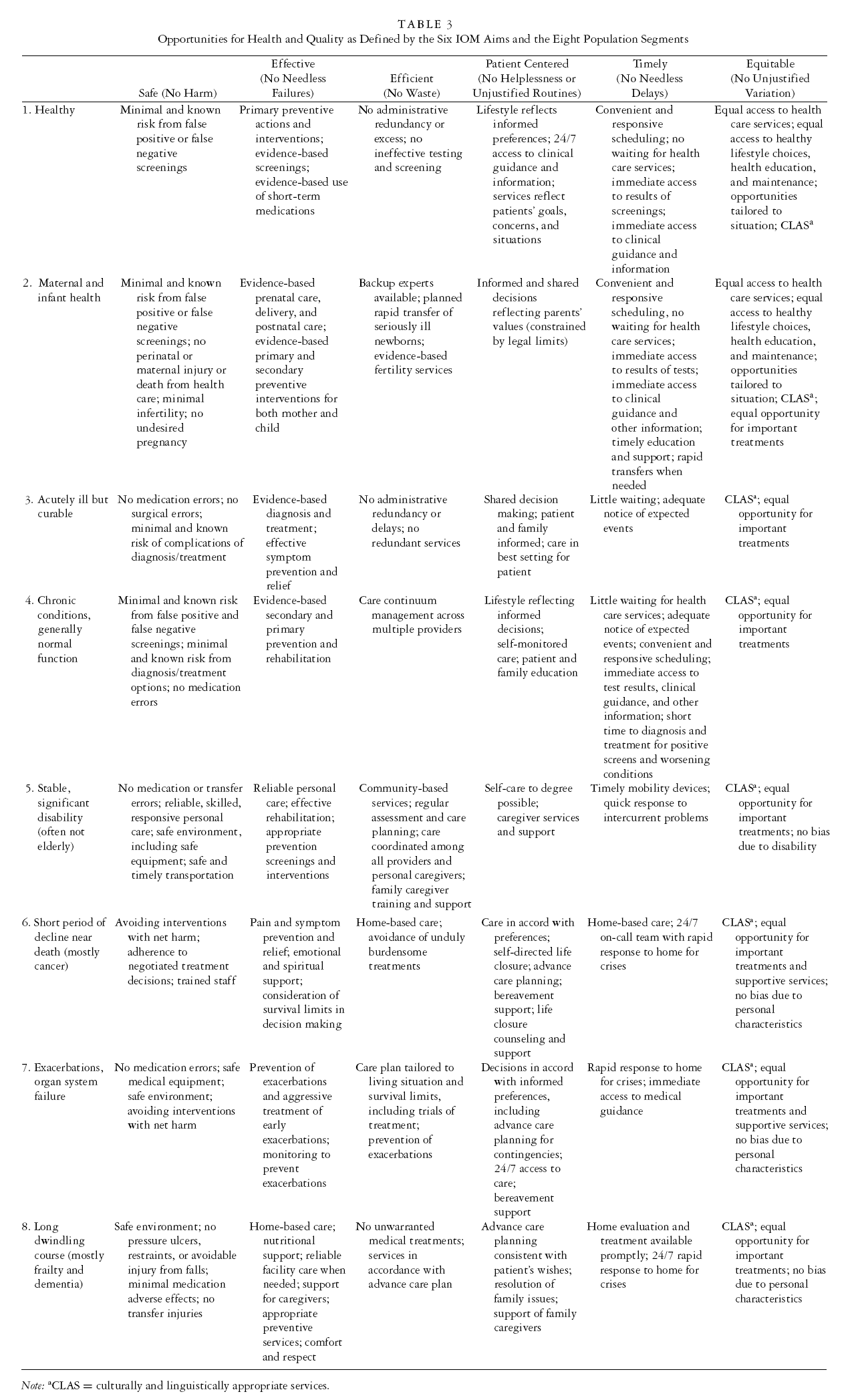 Crossing the Quality Chasm (IOM 2001a) envisioned a system that is safe, effective, efficient, patient centered, timely, and equitable. These aims have become the common framework for assessing providers, although they also frame a more comprehensive person-focused approach to health maintenance and improvement. Matching the priorities of each population segment to the six IOM aims is the central characterization of our Bridges to Health model. Table 3 provides a working understanding of the definitions of quality health care, which includes ensuring that information and supports for patients are available for self-management, measuring progress toward health-related goals, and prioritizing areas needing improvement in each cell of the framework. For example, whereas improvements in safety (a column) could require the prevention of falls and pressure ulcers for the frail elderly (a row), ensuring correct-site surgery is more important to those with acute problems (another row).