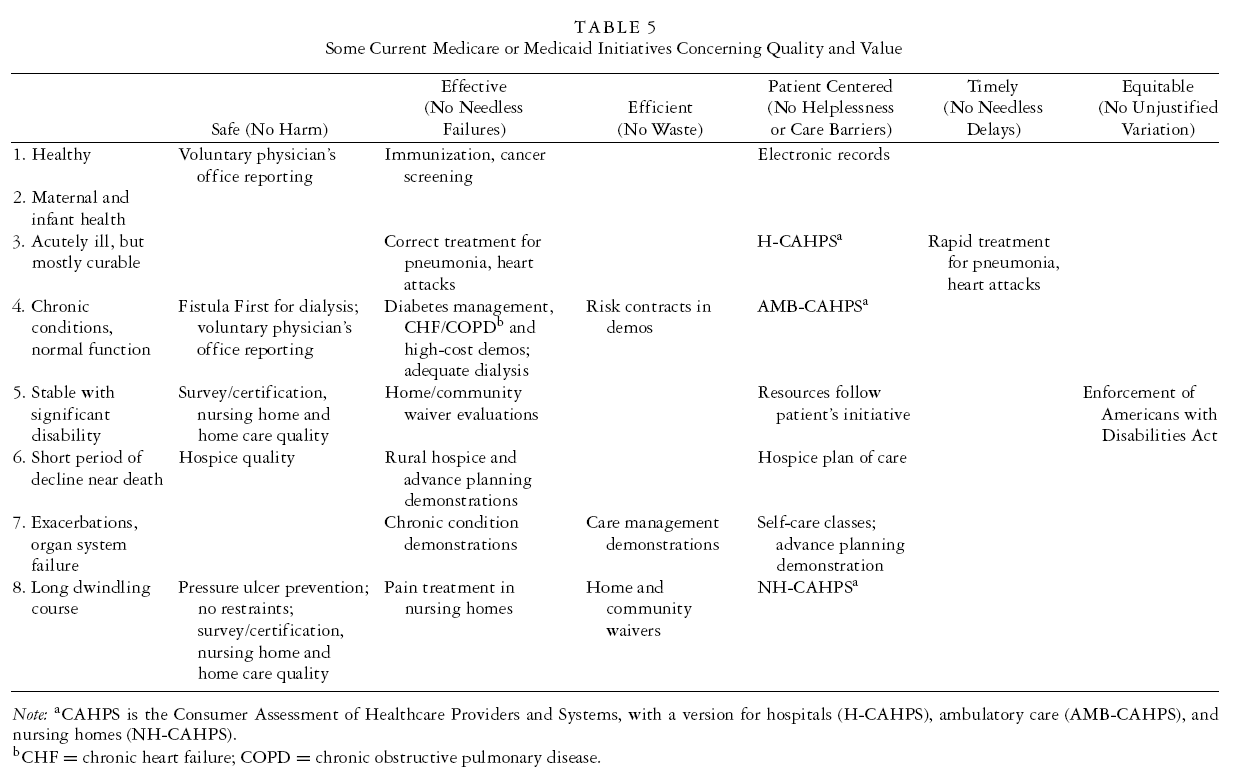 Table 5 provides a similar overview of some of the Centers for Medicare and Medicaid Services’ current and proposed initiatives to address quality. The Bridges to Health model shows the strength and breadth of the current strategies. For example, only a few existing interventions address timeliness and equity, and strategic planners can consider whether these areas offer important opportunities. The structure of table 5 also serves as a template for reporting the progress of widespread improvement activities.