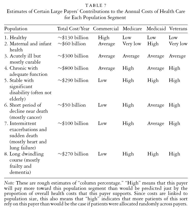 The U.S. health care system has a variety of payers, each with different scope, coverage, and delivery models. Table 7 estimates the comparative distribution of population segments among commercial insurers, Medicaid, Medicare, and the Veterans Health Administration. Clearly, the priorities of Medicare, Medicaid, and the Veterans Health Administration should be somewhat different from one another and quite different from those of commercial insurers. An overwhelming proportion of the stable disabled and the three segments comprising the last phase of life are in the public systems. Medicaid plans now cover about 40 percent of all pregnancies and deliveries (Kaiser Family Foundation 2002; Martin et al. 2003) and have more responsibility in this arena than do other public agencies and nearly as much as all commercial health care plans together. Since public payers also bear substantial responsibility for the overall health of their beneficiaries, policymakers and program managers may find our framework helpful in establishing payment incentives and quality standards that address the populations for which they are responsible.