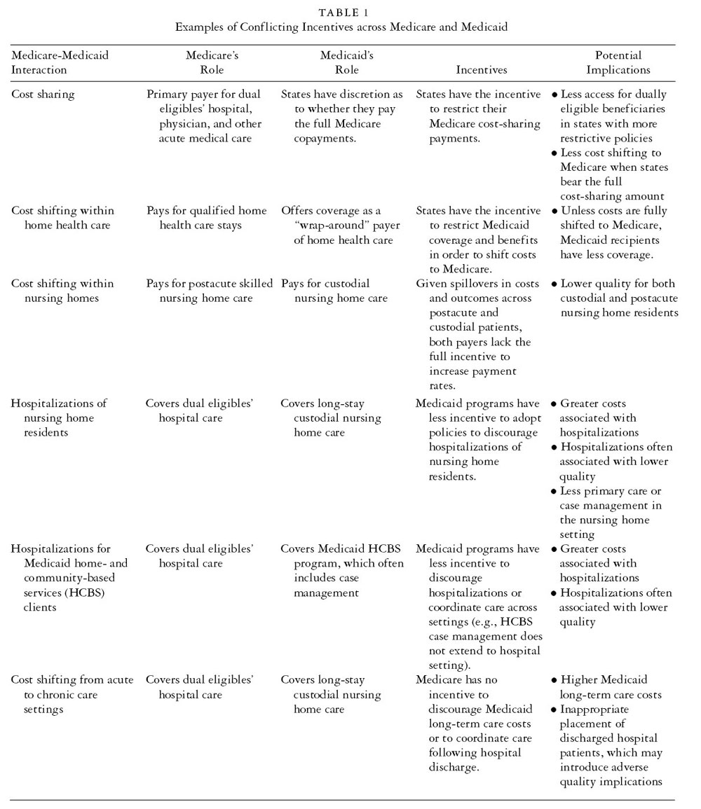 Bifurcated coverage introduces a number of conflicting incentives in Medicare and Medicaid regarding the delivery of long-term care services. This article reviewed the implications of the lack of coordination across the two programs in cost-sharing arrangements, cost shifting within settings such as home health care and nursing homes, and cost shifting across health care settings (see table 1 for a summary). This review offers a number of lessons for the research and policy communities.