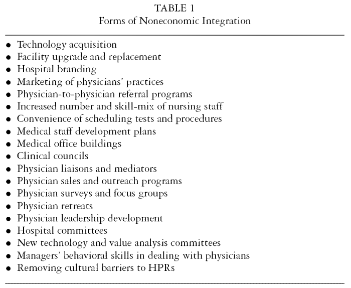 Noneconomic integration refers to hospitals’ efforts to enlist physicians by making their facilities more attractive and accessible, their operations more efficient and convenient, their decision-making processes more participative and responsive, and their staffing better trained. These efforts can take the form of technology acquisitions, hospital branding, process flow improvements, management information systems, physicians’ liaisons, referral services, clinical councils, physician leadership development, medical staff development, and additions to the number and skill mix of the nursing staff. Noneconomic integration also includes hospitals’ efforts to improve managers’ behavioral skills in dealing with physicians and removing the cultural barriers separating them (see table 1).