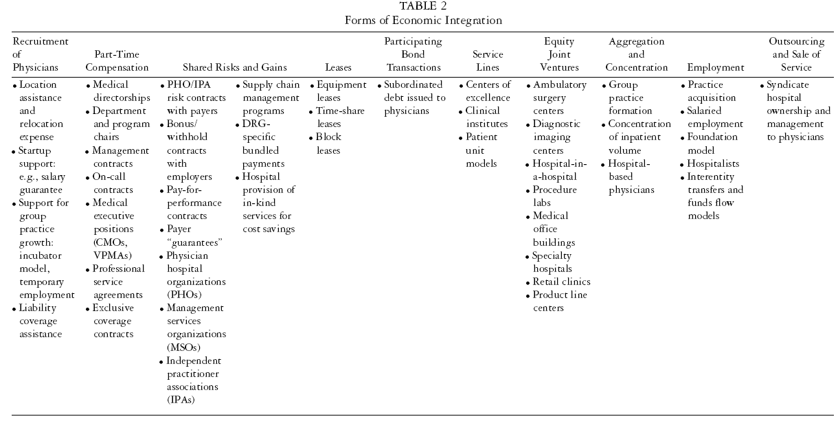 Economic integration encompasses hospitals’ provision of monetary payments to physicians to provide, manage, and/or improve clinical services and to perform organizational activities. These payments can take the form of professional service agreements, medical directorships, stipends, performance bonds, management contracts, gain sharing, leases, and comanagement of clinical institutes and centers of excellence. Economic integration can also include joint-venture investments (e.g., in medical office buildings, ambulatory surgery centers, diagnostic imaging centers, service lines, specialty hospitals) and joint-risk reimbursement contracts from payers (e.g., bundled payments, pay-for-performance, capitated risk). Finally, economic integration can cover the aggregation of physicians into the organization, including the formation of group practices, as well as the employment of primary care physicians and specialists, often based on productivity and quality metrics. Employment models can be either temporary or permanent (see table 2).