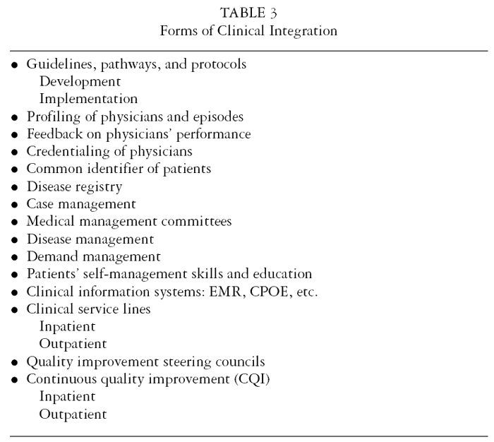Clinical integration refers to hospitals’ structures and systems to coordinate patient care services across people, functions, activities, and sites over time. Common activities of clinical integration are utilization management programs, scheduling and registration systems, information systems that can track utilization by patient and provider, development of care standards, continuous quality improvement programs, clinical service lines, case management systems, population-based community health models, disease and demand management systems, common patient identifiers, and disease registries (see table 3).