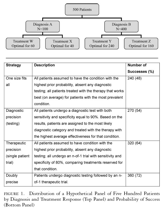 Now consider four treatment strategies (figure 1, bottom panel). The proportion of patients treated successfully is least using the “One Size Fits All Strategy” (48 percent), greater using the Diagnostic Precision Strategy (54 percent), greater still employing a Therapeutic Precision Strategy incorporating n-of-1 trials (64 percent), and best of all using a Double Precision Strategy (testing to elucidate the diagnosis followed by an n-of-1 trial to establish optimal therapy) (72 percent).