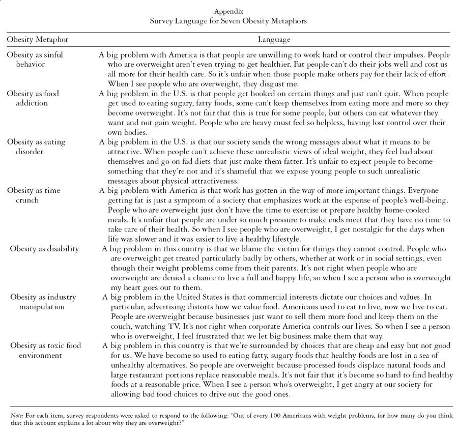 For this study, we examined the role of seven specific metaphors about the causes of obesity, derived from elite discourse and refined using in-depth qualitative research methods. (For more details about the initial identification of these seven metaphors, see Schlesinger, Brescoll, and Barry 2008.) These metaphors are (1) obesity as sinful behavior (e.g., sloth, gluttony); (2) obesity as a disability; (3) obesity as a form of eating disorder; (4) obesity as a food addiction; (5) obesity as a reflection of time crunch; (6) obesity as a consequence of manipulation by commercial interests; and (7) obesity as a result of a toxic food environment.